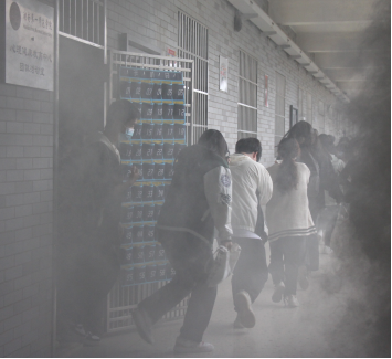 实验室疏散演练于特立楼四楼心理团辅教室开展。在演练开始前,唐教官进行了演习报备,规划好了疏散路线,并向同学们强调了疏散秩序。随着警报响起,烟雾逐渐弥漫整个教室及走廊。在老师和教官的引导下,同学们从教室前后门分成两队,捂住口鼻弯腰前进,迅速撤离到了三楼露台。集合完毕后班长清点人数,确认全员到齐。整个演习过程紧张有序,人员撤离有条不紊,达到了消防演练的预期效果。