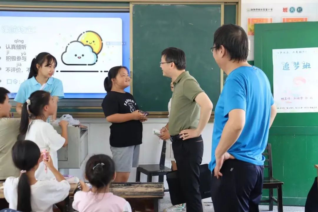 刘书记一行到达书江完小后,首先旁听了部分课程,查看了组织有序的课堂。随后观摩了汇报演出部分节目的彩排现场,称赞孩子们的表扬充满童趣,富有朝气。最后与师生志愿者进行座谈。胡经理亲切关心团队实践、社会服务、衣食住行等方面的情况;张副书记深入了解实践队员社会实践的感受,关心关怀实践队员授课情况。刘书记希望大家珍惜社会实践锻炼机会,在实践中感悟青春、收获成长,促进自身的全面发展。实践队员纷纷表示,一定会珍惜此次宝贵的实践机会,在实践中练就本领,在实干中锤炼品格,以更加昂扬的姿态和饱满热情为祖国的建设添砖加瓦。