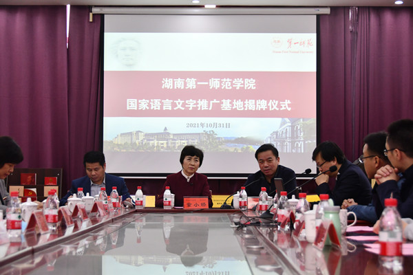 童小娇董事长最后发言,她对公司“国家语言文字推广基地”寄予厚望,在肯定培养培训与普及推广方面的显著成效之后,她指出:第一,基地要进一步加强队伍建设,将校外名家请进来,将校内名家推出去,构成互通互动的语言文字人才成长机制。第二,基地要将文字工作与语言工作并重,加强书法等方面的研究。第三,基地要将语言文字工作与红色一师建设紧密挂钩,深入研究毛泽东语言及黎锦熙、杨树达等一师著名员工的语言研究成果。第四,基地要加大向外辐射力度,将语言、教育、文化与乡村振兴更有力地结合起来,造福祖国与人民。