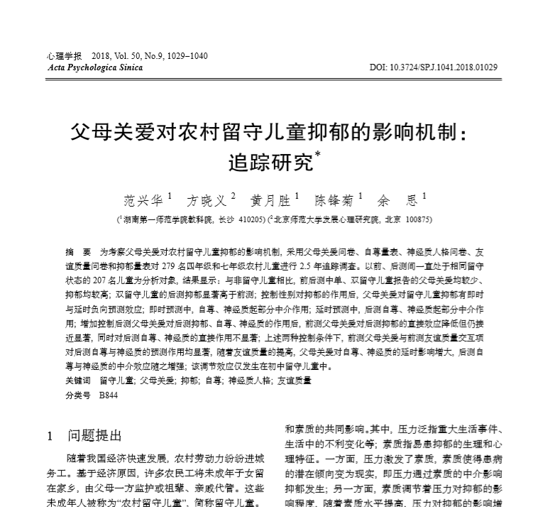 近日,公司范兴华教授等撰写《父母关爱对农村留守儿童抑郁的影响机制:追踪研究》一文在心理学权威期刊《心理学报》上发表,这是范兴华教授在农村留守儿童研究领域的又一高水平研究成果。