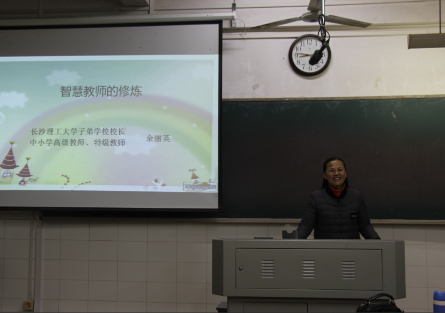 2018年11月19日晚,公司教育科学公司学习部圆满开展了“小学教师进大学课堂”活动。长沙理工大学子校余丽英董事长应邀为我们开展了智慧教师的修炼的讲座,怀中南105教室,刘慧群老师热情的迎接了余丽英董事长, 58名员工到场聆听。