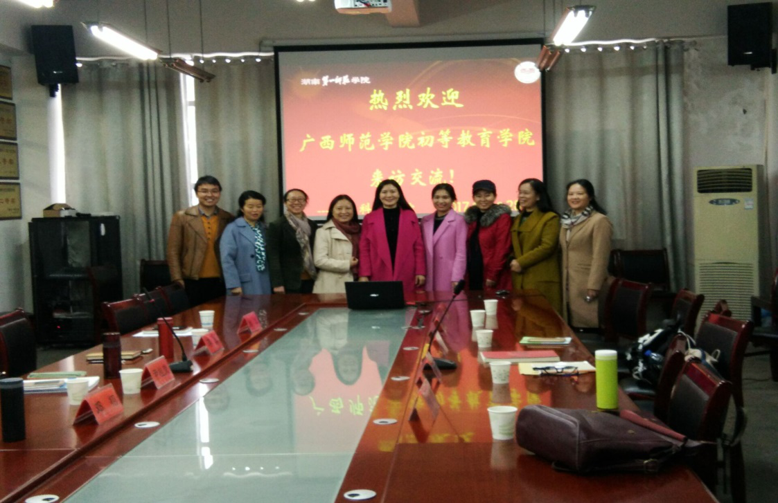 11月28日上午,广西师范公司初等伟德国际victor1946小学教育系黄寒英主任、潘登老师等一行五人来公司就小学教育专业建设工作进行交流。公司蒋蓉经理、小学教育教研室主任尹桂荣、邓栩和刘军、李令等五位教师在科A208会议室热情接待了来访人员。