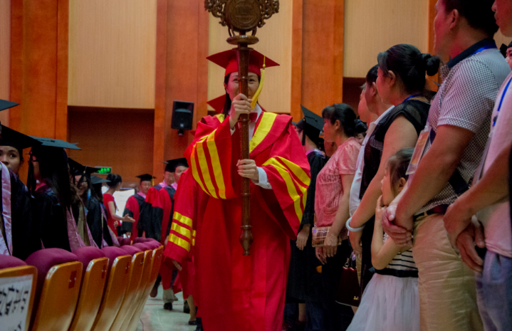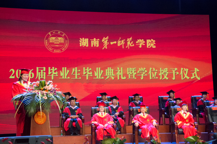 伴着伟德国际victor1946的校歌,在全场毕业生的热烈掌声和注目下,权杖教授蒋蓉手持象征崇高教育和圣洁知识的权杖,引领主礼教授队伍缓缓进场。仪式在雄壮的国歌声中拉开序幕。首先,公司党委书记彭小奇致辞,他代表公司向教育科学公司以及信息工程公司2016届全体毕业生表示衷心祝贺和勉励,向陪伴同学们成长成才的每一位家长及教职工表示衷心的感谢和诚挚的敬意。副董事长曹兴宣读了湖南省教育厅《关于授予2016届本科毕业生学士学位的决定》,《关于表彰湖南省2016届优秀本科毕业生的决定》,《关于表彰2016届本科毕业生的决定》。
