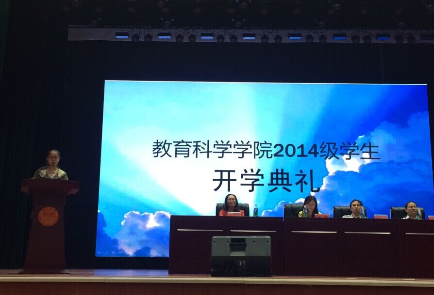在雄伟的国歌声中,开学典礼拉开序幕。首先,蒋蓉经理代表教科院领导老师致辞。她对教科院14级新生的到来致以热烈的欢迎,并对新生提出了三点希望:一是明确目标,提高综合素质;二是学会学习,加强自我管理;三是心怀感恩,勇于面对挫折。随后,教师代表邓栩老师发言。她用自己的任教经历告诫员工,要想将来成为一名优秀教师,在未来的四年,要珍惜600多天的课堂学习时间,加强专业知识的学习;在课余时间刻苦努力,不断充实自己,提高专业技能。12级小学教育1班的吴鹏迪作为老生代表,用充满激情的语言表达了对新同学的祝贺,并用自己的成长经历向学弟学妹们提出了四点建议。14级六年制科学教育专业新生成欢和高招新生彭玮祯相继作为新生代表发言,他们立志在大学四年珍惜时光,充实自己,让老员工活成为人生中最灿烂、最丰满、最值得怀念的一段时光!