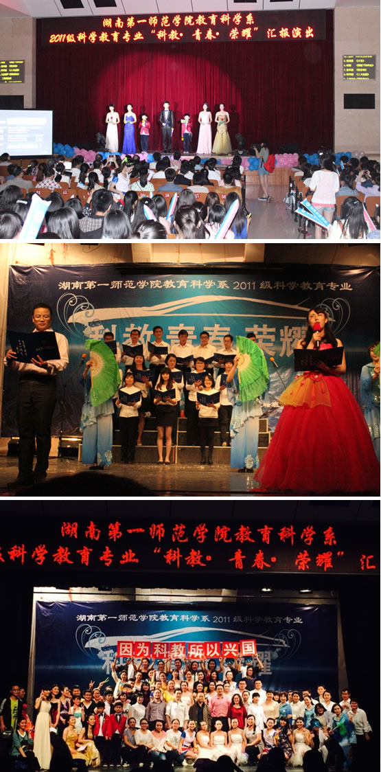“因为科教,所以兴国;因为科教,心心相守”,汇报演出在2011级科学教育1班的班歌《因为科教》合唱中落下帷幕。