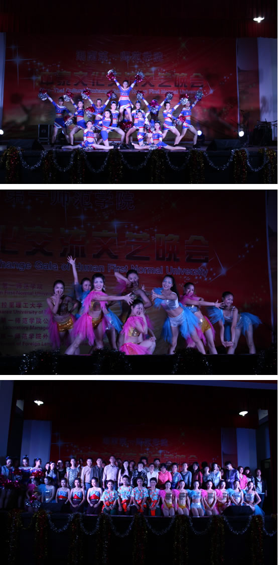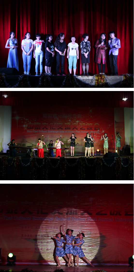 晚会的第二篇章为中国之韵。我系同学们为来自异国他乡的朋友献上了民乐合奏、现代舞蹈、女声独唱、健美操表演等节目。完全不同文化风格的表演在同一个舞台上展现,相互映衬,相得益彰,魅力四射。晚会结束后,泰国朋友们与我系师生合影留念。