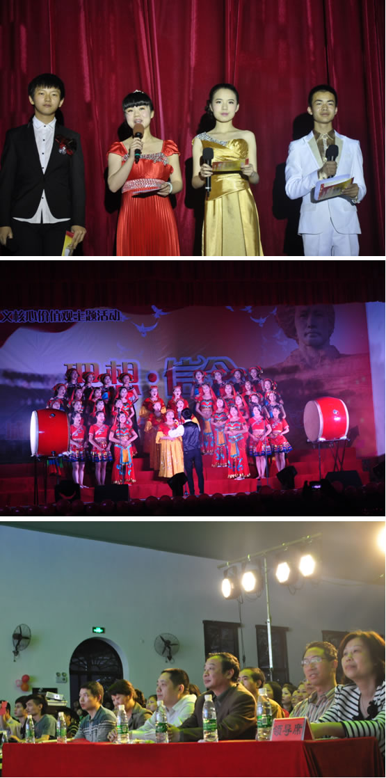 5月15日晚,教育科学系城南书院校区2014年“理想•信念”班级合唱•朗诵大赛决赛在城南书院校区大礼堂隆重举行。董事长肖湘愚、副董事长刘志敏出席比赛,公司党政办副主任彭晓辉、组织统战部副部长魏全顺、宣传部副部长李宣平、员工处处长何文、副处长杨虎智、人才招聘处处长杨家福、校团委书记任晓晴、教务处副处长温群雄、青年毛泽东纪念馆馆长艾建玲以及教育科学系、中文系、数学系、外语系负责人应邀与教育科学系近千名师生代表观看了比赛。