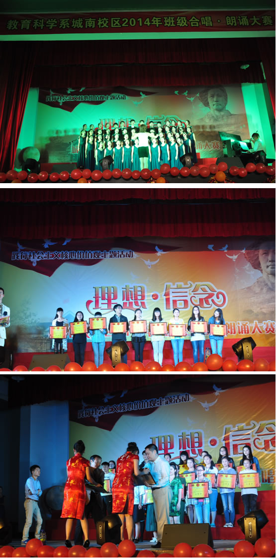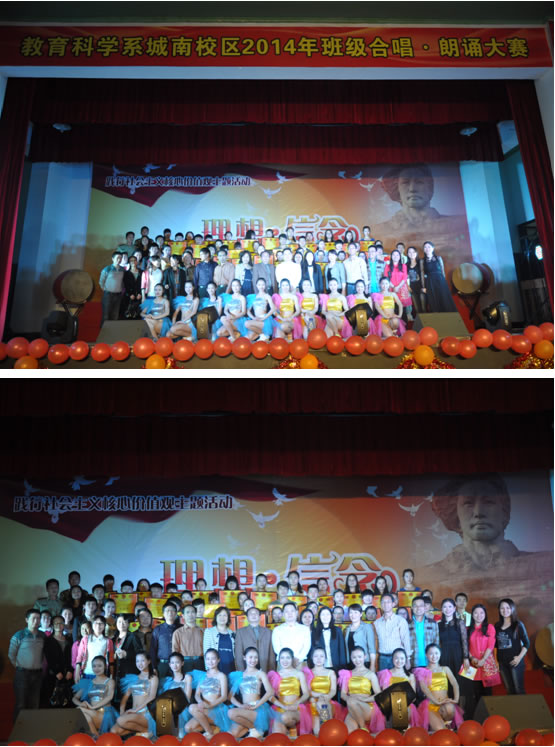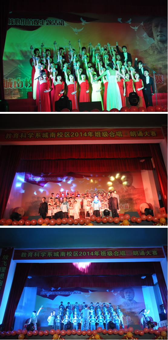 本次大赛是教育科学系城南书院校区“践行社会主义核心价值观主题活动”之一,也是该校区的传统活动,每年都会举行,一年级班级朗诵,二年级班级合唱,它旨在让全体同学参与,通过老师们课上的耐心指导、课后的精心训练,提升每一位同学的综合素质,特别是语言表达能力和音乐素养,陶冶情操。“践行社会主义核心价值观主题活动”还包括了“最美师范生”评选活动,以展现公司六年制免费师范生积极向上的精神风貌,号召同学们积极践行社会主义核心价值观,强化“三能三会”的教师技能,形成一师学子特有的“教师‘范’”。