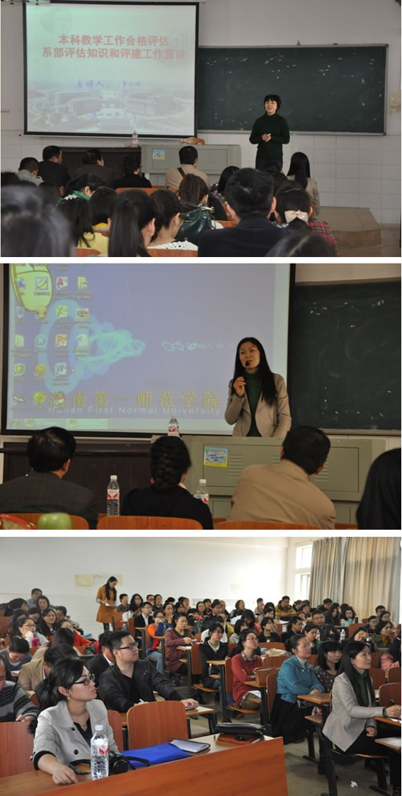 2014年4月1日在东方红校区文b201,教育科学系举行“本科教学工作合格评估工作宣讲暨课程教学改革经验交流会”。会议由系主任蒋蓉教授主持,副董事长、校评建工作领导小组常务副组长童小娇教授到会做专题报告,教务处评估中心李婷、系部党政班子成员及全体教职工参加了会议。
