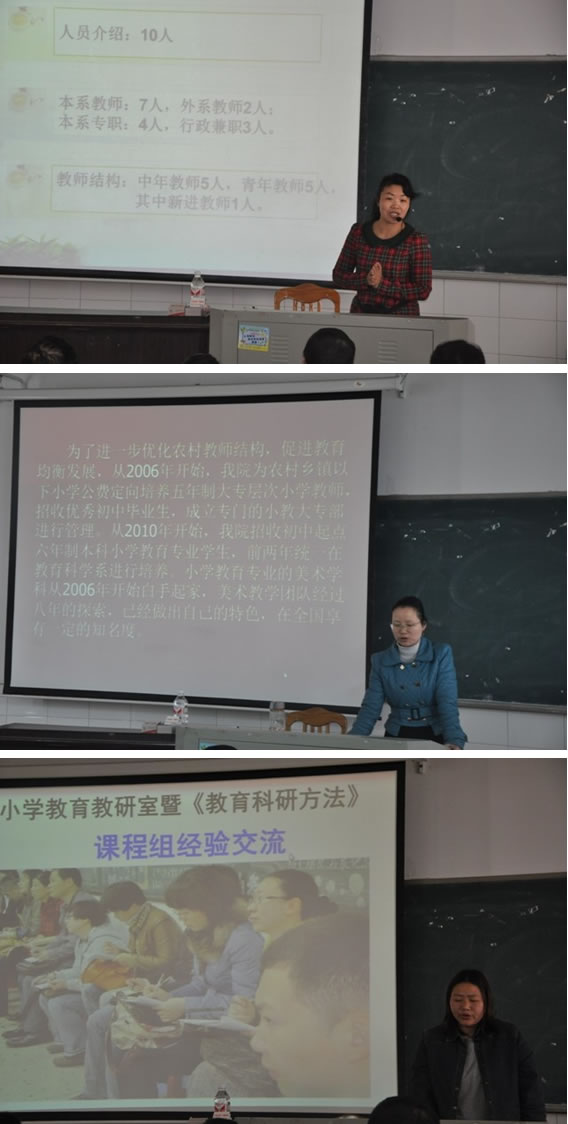 宣讲会后,蒋蓉主任主持召开了课程教学改革经验交流活动。教科系为切实加强课程建设,提升教学水平,积极推进课程组的建设,各课程组定期围绕课程体系、课堂教学、教书育人等问题进行研讨,积累了许多形之有效的经验。在本次交流会上,教师口语课程组负责人李晖旭、小学实用美术课程组负责人张容舟、教育科学研究方法课程组负责人曾晓洁分别就各自课程组在教材建设、课程内容体系改革、教学手段改革、评价方式创新、课内课外沟通衔接、员工技能训练、青年教师培养等多方面的经验做法及取得的成绩。现场气氛热烈,老师们纷纷表示深受启发,今后在教学中也会借鉴这些成功经验。