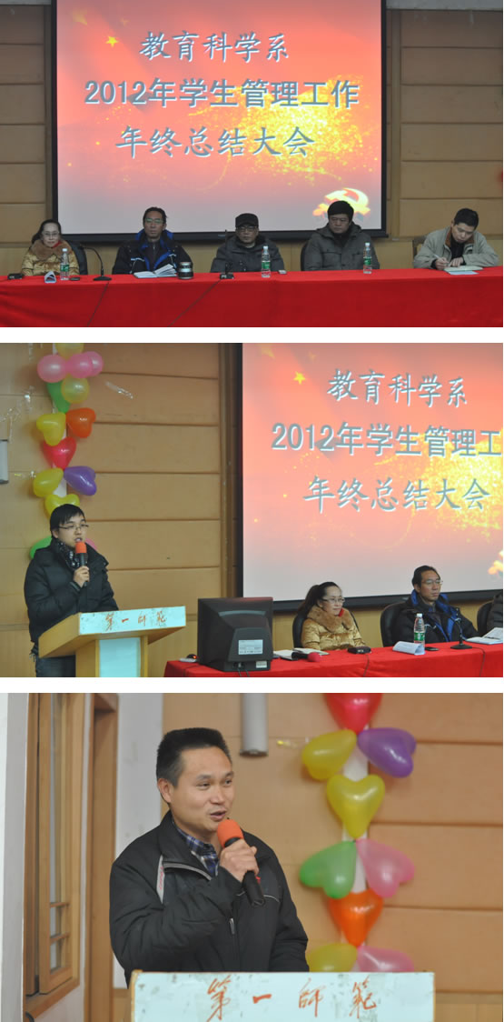 12月28日下午,我系2012年度员工管理工作总结大会在城南校区多功能报告厅隆重举行,员工处丁立平副处长、保卫处陈敬德副处长,系党总支张尚晏书记、谭玉兰副书记、蔡海军副书记出席大会,教育科学系全体专兼职辅导员参加了会议。
