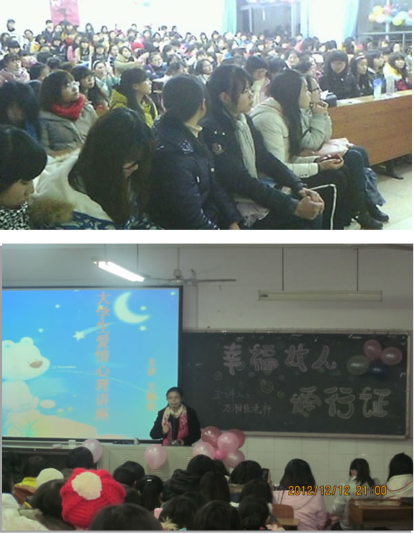 由教育科学系员工会女生部策划和举办的《幸福女人通行证》讲座,于2012年12月12日晚7点在文科楼b栋101如期举行。此次讲座,是女生部组织的“做幸福女人”主题系列活动的压轴戏。在讲座之前,女生部开展了优秀海报征集、宣传栏设计、“我手写我心”等系列活动。特别是“我手写我心”活动,于12月11日—12日在员工宿舍三岔路口举行,该活动鼓励女生说出自己的心里话,写下自己的幸福感言,为“做幸福女人”主题系列活动增添了一抹亮色,扩大了影响力。