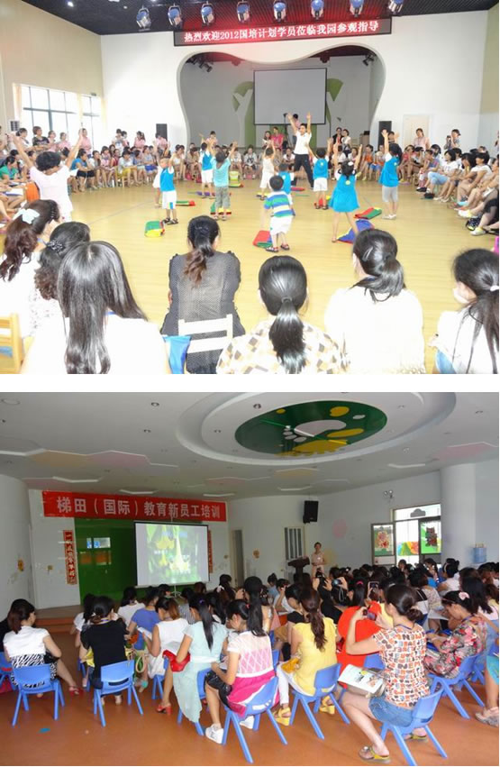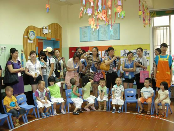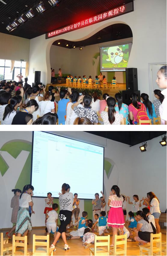 8月6日上午,我系“国培计划(2012)”伟德国际victor1946农村幼儿园教师培训班 160名学员在公司专家的带领下,来到长沙市明德麓谷幼儿园进行教学观摩。学员们认真观摩了谭娜、吕奕、邹勇三位幼儿园老师分别上的《小小鸡蛋把门开》、《毛毛虫与蝴蝶》、《袋鼠宝宝》语言、音乐、体育活动课。三位授课老师采用生活化、游戏化的教学方法,在孩子们快乐而投入的学习与游戏中,学员们也情不自禁的走进他们,和他们一起做游戏。观摩课结束后,专家与学员们分小组进行了品课活动。