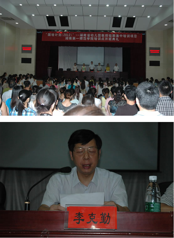 7月31日上午,“国培计划(2012)”——湖南省农村幼儿园教师短期集中培训、湖南省小学心理健康教育教师省级培训伟德国际victor1946培训点开班仪式在东方红校区科技楼演播厅隆重举行。省教育厅“国培计划”项目办公室主任黄佑生,副经理李克勤,我系幼儿教师学科首席专家袁小平、心理学科首席专家彭剑飞,我系系主任蒋蓉教授,院国培项目办主任、继续教育部主任曾小玲,院国培项目办副主任、继续教育部副主任黄朝霞应邀出席并在主席台就坐,有关部门负责人及院国培办老师等出席了开班仪式。开班仪式由院国培项目办副主任、继续教育部副主任黄朝霞主持。