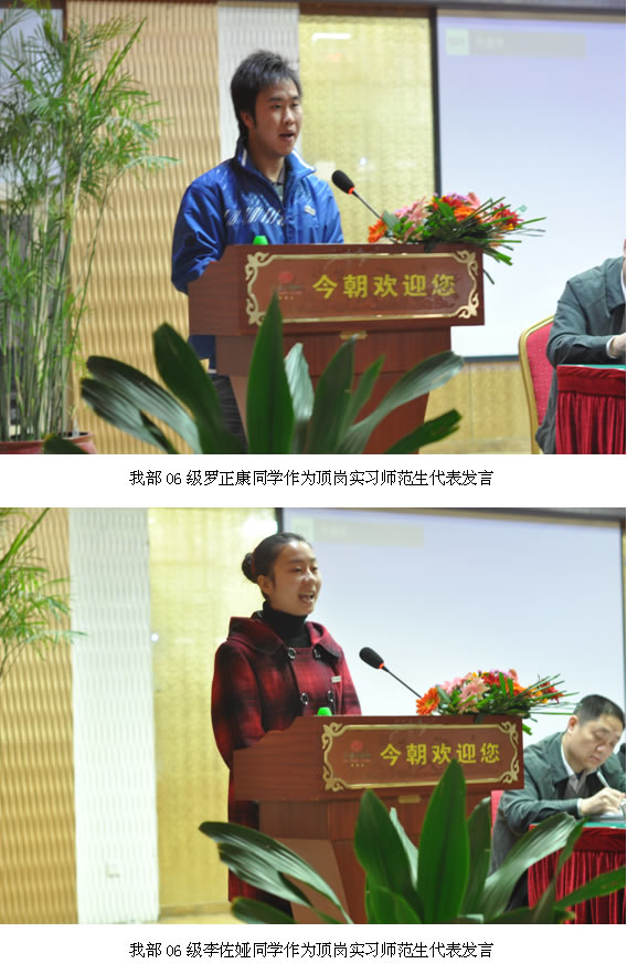 在该次研讨会中,我部选送了实习队的实习简讯以及部分实习生的美术手工作品参加展出,简讯及手工作品得到了与会领导和老师们的高度评价。此外,06级罗正康、李佐娅两名同学作为顶岗实习师范生代表发言。罗正康同学系小教大专部526班员工,在这次顶岗实习中,罗正康同学为桂东县实习队队长,在沙田中心小学担任顶岗实习教师。在发言中,罗正康同学提到:一个学期的顶岗实习时光,自己收获了很多,感悟也特别多。作为第一批农村免费定向师范生,顶岗实习更进一步坚定了同学们的从教信念。通过顶岗实习,“我清楚地明白,我的责任是走出大山,再走进大山。我将用自己的一举一动、一言一行,去实现我生命的意义和真谛。”罗正康同学的坚定表态,引起了台下的阵阵掌声。李佐娅同学系小教大专部523班员工,在本次顶岗实习中,担任怀化市通道县实习队的副队长,实习公司为县溪中心小学。李佐娅和与会代表分享了自己与农村公司师生们相处的点点滴滴,在发言中,佐娅同学数次哽咽,各位嘉宾被一次次感动。“顶岗实习,让我真实地感受到,作为教师,我们肩负着非常重大的责任”;“衷心感谢教育局公司领导的关心,感谢指导老师的鼓励,感谢班级员工的认可,是他们让我体会了身为人师的喜悦,同时,也让我坚定了成为一名农村人民教师的决心”!