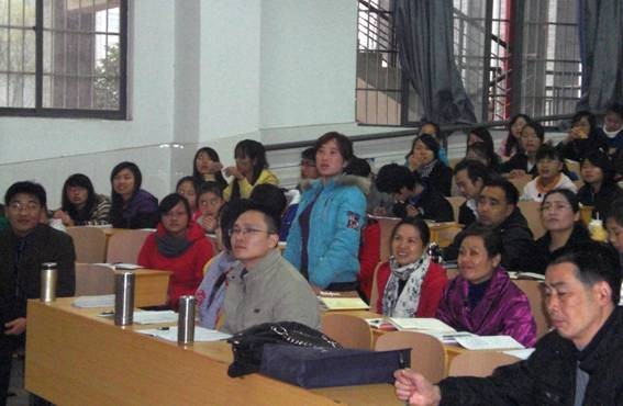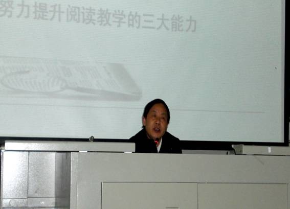 刘经理首先从阅读教学教什么、阅读教学的目标与任务及对传统阅读教学的认识展开了对阅读教学的思考,接着谈了自己对阅读教学几个理论问题的理解和认识,最后重点阐述了如何努力提升阅读教学的文本解读能力、教学设计能力及教学实施三大能力。刘经理充满激情的讲座、严谨的治学态度向全体师生展示了他儒者的风范。刘经理在引用一个个生动典型的教学片段时让师生们回答问题并提出自己的观点,在积极热烈的互动中引出自己的学术观点,同时在对自己鲜明的观点娓娓道来时,也不忘与师生们共同交流探讨学术问题。