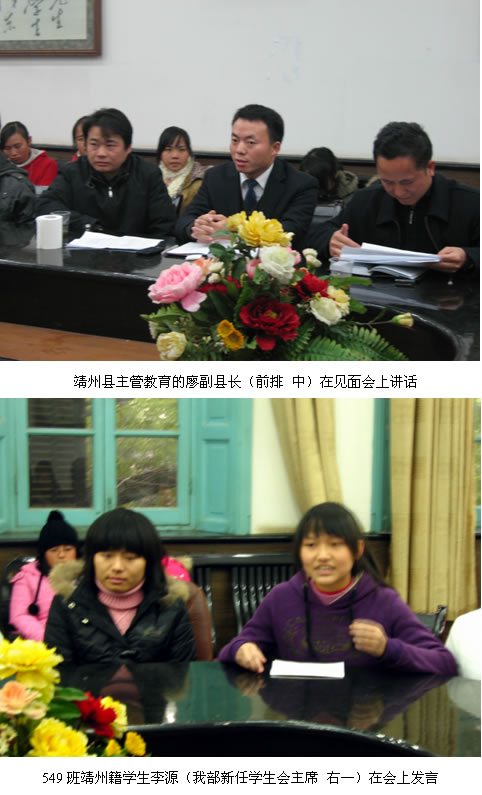 见面会上,靖州县的三位领导做了重要讲话,表达了他们对靖州县小学教育的远见卓识、对靖州籍员工的亲切关怀,同时也给员工们提出了殷切期望:“一定要珍惜,一定要刻苦,一定要修德,一定要争气”。靖州籍员工踊跃发言,向家乡领导汇报了在一师求学的精彩生活,都表态一定要更加努力学习、苦练本领,为靖州小学教育的明天顶起一片蓝天。