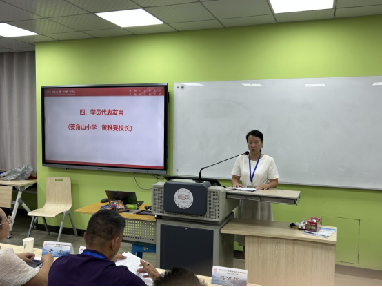 来自永州市零陵区菱角山小学黄雅旻董事长作为学员代表发言,明确表态要把握机会,明确目标,学以致用,促进专业发展,提升教育管理决策能力和公司管理水平。