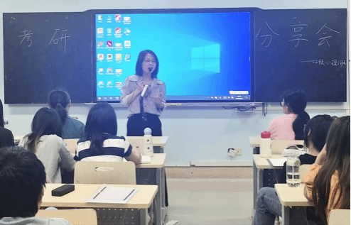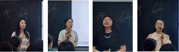 廖婷、刘盼、欧怡乐和肖雯四位同学对22级即将准备考研的同学们进行分享,学姐们提醒同学们“考研从来不是死里逃生,而是锦上添花的过程”;陈佳俐、邵欣欣、曾熠晗三位同学对23级全体员工进行分享,告诉23级同学提早布局,并且提醒同学们坚持到底“黎明之前最黑暗,放弃就是大笨蛋”。