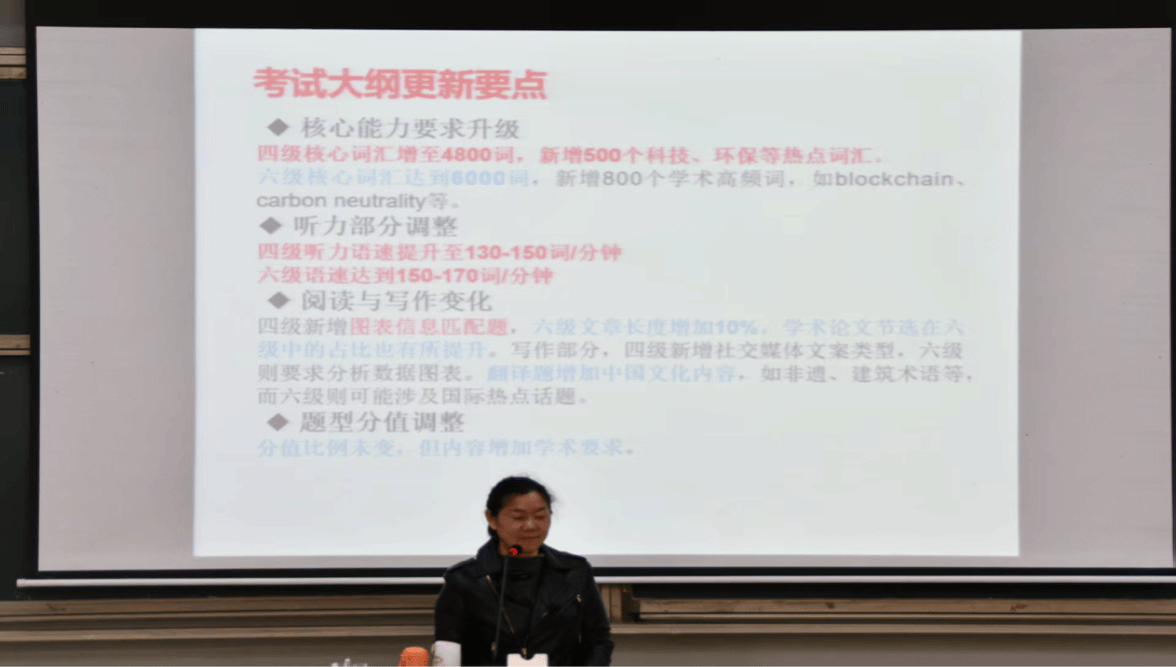 同学们通过本次讲座不仅了解了四级考试的各项要求,更重要的是掌握了有效的备考方法。大家特别注意到邓老师强调的“得听力阅读者得四级考试”这一要点,将按照老师的建议,重点加强听力和阅读训练,同时认真研读近五年真题,为即将到来的四级考试做好充分准备。