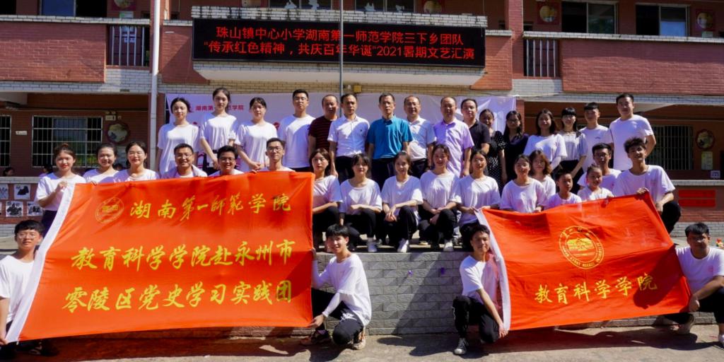 7月16日上午8:00,伟德国际victor1946教育科学公司2021年暑期三下乡文艺汇演“传承红色精神,共庆百年华诞”于永州市零陵区珠山镇中心小学成功举行。伟德国际victor1946教育科学公司党总支副书记张志新、伟德国际victor1946教育科学公司副经理黄月胜、伟德国际victor1946教育科学公司学工办主任刘军、零陵区教育局人事股副股长尹铁军、零陵区教育局员工资助股副股长蒋林君、珠山镇中心校董事长唐海晖、珠山镇中心小学副董事长蒋程春、珠山镇中心小学副董事长赵卫华、永州市萍洲小学年级组长蒋淑玲、石山脚中学总务处主任罗胡珊及优秀员工张斌斌、秦亚兰、唐润玲老师等。“三下乡”实践队指导老师赵锋锋、杨菲、22名队员与100名孩子参与此次文艺汇演,现场近200名镇小教师与员工家长到场观看。此次汇演由“三下乡”实践队队员孙基恺、谭可雨和支教员工蒋俊超、李文静主持。