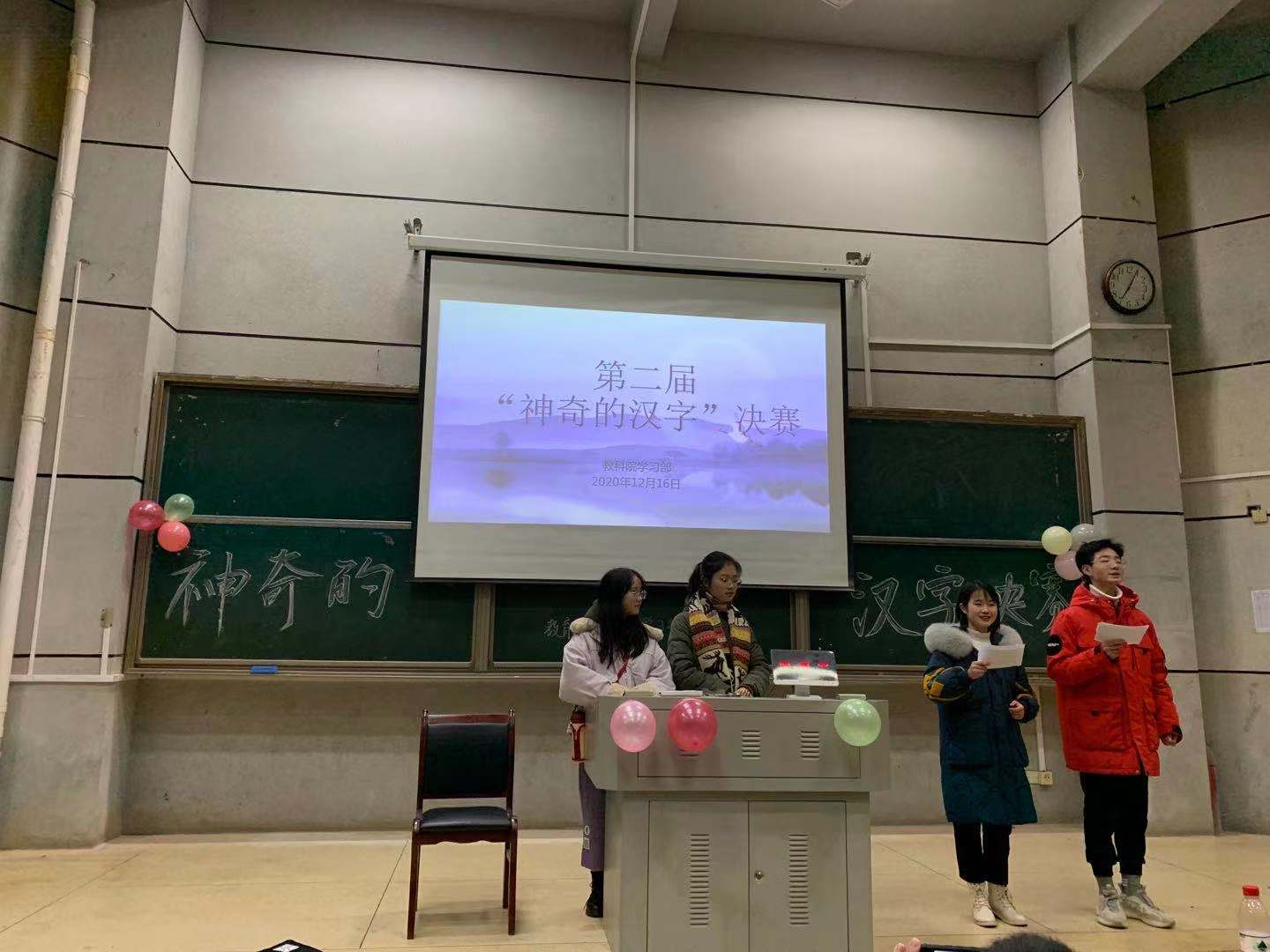 为弘扬汉字传统文化,教育科学学院于12月16日晚7点在怀中楼南栋110举办了第二届“神奇的汉字”学习节活动,教科院学工办主任刘军老师、教科办郑雅匀老师、辅导员石慧老师、杨菲老师、赵锋锋老师参与此次活动。
