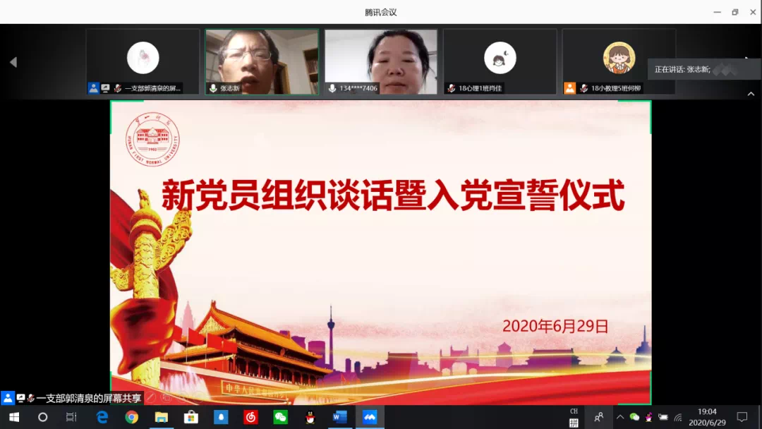 2020年6月29日晚上7点,教育科学公司员工党支部顺利召开“新党员组织谈话暨入党宣誓仪式”会议。此次会议的主要内容是对罗顺等44名新发展的预备党员进行集体谈话和举行入党宣誓仪式。出席本次大会的有陈天涯书记,胡春光副书记,张志新副书记,曾晓洁委员,黄月胜委员,学工办刘军老师,支部书记董晓娅老师、廖弘宇老师,以及员工党支部新发展党员的44名同志。会议由公司党总支副书记张志新主持。