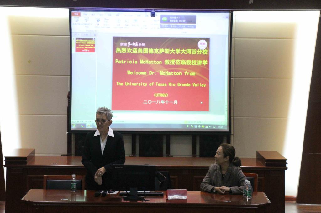 2018年11月12日下午,美国德克萨斯里奥格兰德河谷大学执行副董事长Patricia McHatton教授应邀作为主讲人于特立楼南栋112教室开展Teaching Education专题的讲座,Dr. Steven Block、Dr. Alma Rodriguez以及国际交流中心余欣老师也应邀出席,一百余名员工到场聆听。