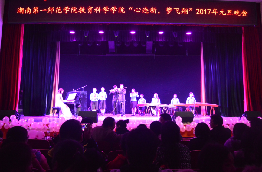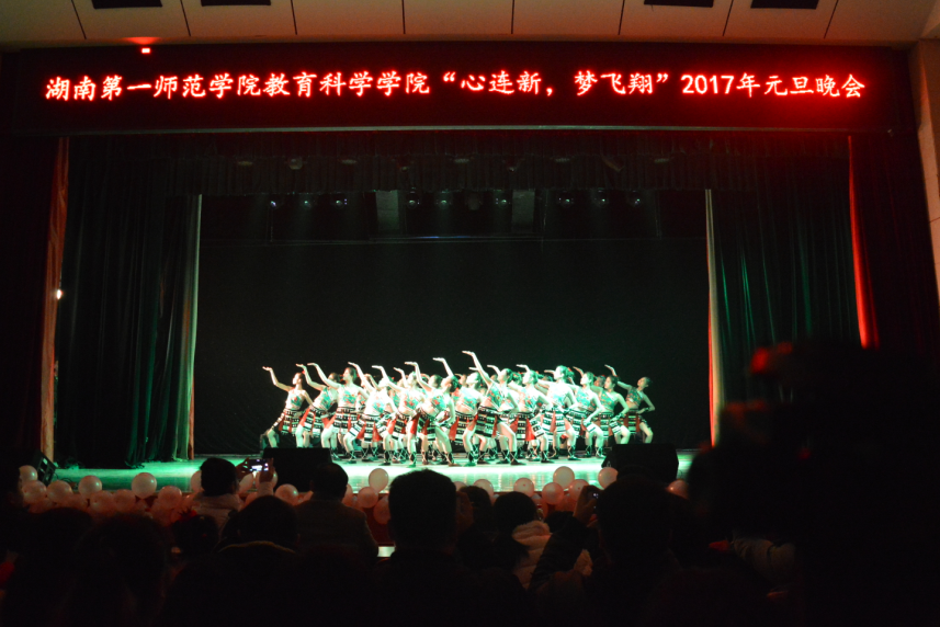 12月27日晚,教育科学公司 “心连新,梦飞翔” 2017年元旦文艺晚会在科技楼演播厅隆重举行。董事长童小娇、教育科学公司负责人陈天涯、张俭明、王建平、胡春光、刘丽群全体辅导员及部分老师代表应邀出席,与400余名在场员工共同观看了晚会。
