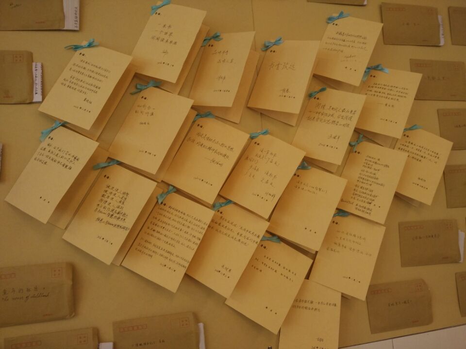 “读书漂流”活动组委会要求参与活动的同学推荐一本喜爱的书籍,并写下推荐理由,收到推荐信的同学阅读此书并记录下感悟,装进同一信封。旨在让同学们利用书信的形式匿名进行书籍阅读的感悟交流。本次成果展便展出了活动中同学们交流感悟的书信。现场教室中心有一个用桌椅组成“书”字,并用橘黄色的灯光以及舒缓的音乐营造了轻松自由的阅读气氛。桌上摆放了部分书信以及书信中推荐的数十种书籍,后墙上张贴了书信以及公司领导、老师们对此次活动的寄语。展示过程中还收录了许多同学观展后的感悟和建议。