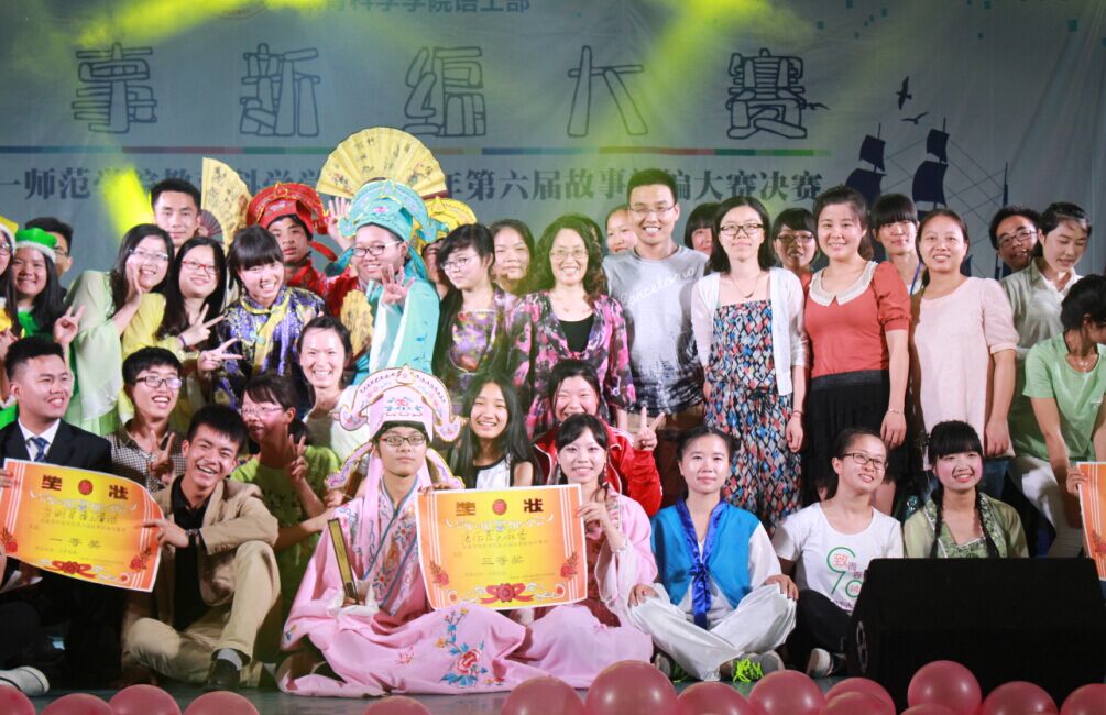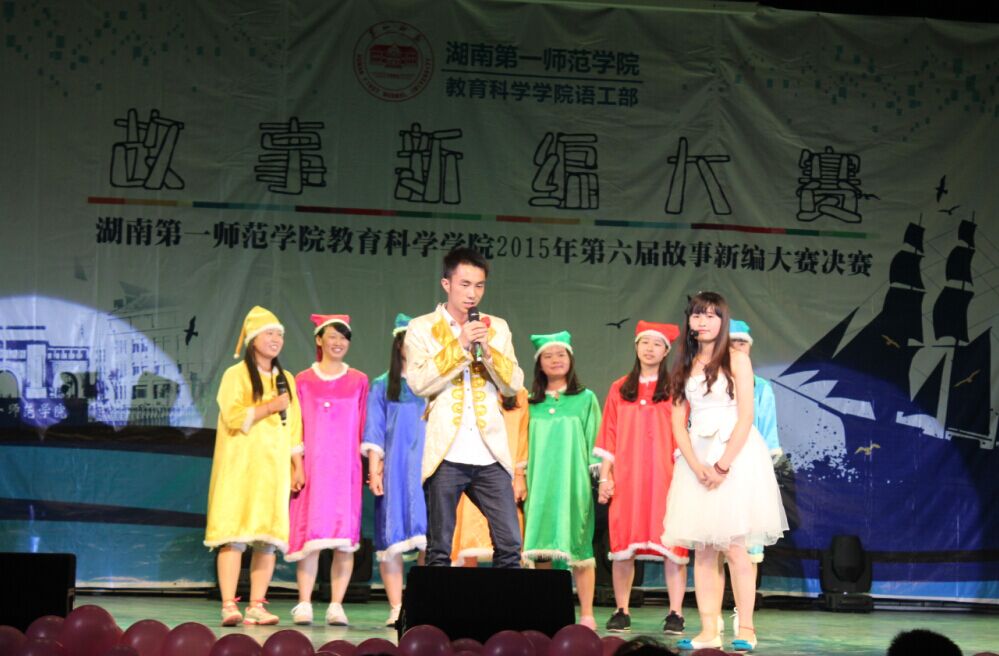 一首开场歌曲带动全场气氛,比赛正式拉开帷幕。此次比赛得到了各个班级的大力参与,经过初赛、预赛层层筛选,最终8个精彩的节目入围决赛。首先第一个上场的是由14级学前教育1班、2班带来的《新后羿射日》,表演者巧妙地将古代故事与当代空气污染的问题相结合,呼吁大家社会爱护坏境。第二个上场的是由14级小学教育理科4班带来的《新唐伯虎点秋香》,表演者活灵活现将一师范校训以及社会主义核心价值观等融入剧中,赢得满堂喝彩。由14级科学教育1班带来的《孔雀东南飞》表演入木三分,最后以“我相信”结尾,引人深思。14级小学教育文科3班带来的《望娘滩》画面感强,表演者将该剧表现的淋漓尽致,诉说了一个凄美的关于母子情深的故事。14级小学教育理科5班演出的《新白雪公主》以搞笑诙谐的风格,给观众留下了“善良的人会变得更美丽”的启示。由13级小学教育3班带来的《孔乙己求职记》在夸张搞笑中从侧面揭露了当今求职难的社会现实,鼓励我们要努力学习,提高自身的专业知识。14级小学教育文科1班的《阿凡提智斗巴依老爷》讲述了阿凡提路见不平,帮助别人智斗巴依老爷的故事,其中表演巴依老爷的男生用富有魅力的语言、符合语言情境的动作、表情演绎了一位故作聪明,实则愚蠢的剥削者的形象。最后上场的是13级科学教育634班、小学教育1班带来的《当明星撞上童话》,该剧告诉我们要适应当代生活,对未来要充满梦想和希望。最后,在语工部带来的动感啦啦操中,大赛落下帷幕。