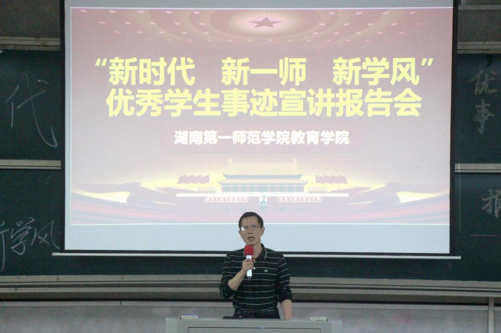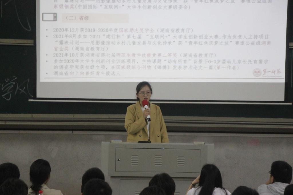 此后,国家奖学金获得者员工代表朱婷上台发言。她提出同学们不仅要关注课堂上的学习,也要注重课后的探究。她建议同学们积极参加创研比赛,并分享自己参加比赛的经验方法和体验收获。接着,考研成绩优异员工代表聂思怡发言。她激励同学们积极参与实践活动,分享自己考研的经验——“选择大于努力”。最后,润之班优秀员工代表旷宏亮进行分享。他表示政治素养是一名老师最基本的素养,提出作为未来的人民教师要有宏伟远大的理想追求、严于律己的人生态度和丰富渊博的知识储备。