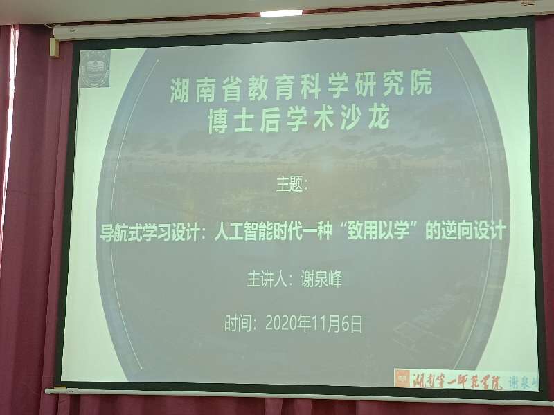 11月6日下午,湖南省教育科学研究院博士后学术沙龙活动在公司东方红校区怀中南208会议室举行。湖南省教科院博士后导师、省教科院博士后工作站首席专家、原湖南省教育厅厅长张放平教授,湖南省教科院博士后导师、湖南科技职业技术公司党委书记李三福教授,湖南省省教科院博士后合作导师、湖南师范大学博士导师刘要悟教授,湖南省教科院高教所副所长盛正发教授,湖南省教科院科研处处长毕树沙研究员,伟德国际victor1946副董事长曹兴教授,伟德国际victor1946教育科学公司党总支陈天涯书记,伟德国际victor1946教育科学公司经理胡春光教授,湖南省教科院博士后工作站10余位博士后,教育科学公司部分教师和员工参加了本次沙龙活动。沙龙由湖南省教育科学研究院朱罗敬博士后主持,教育科学公司谢泉峰博士作“导航式学习设计:人工智能时代一种‘致用以学'的逆向设计”报告。