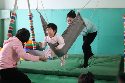 第二节是感统训练课程,由琴琴老师执教,她根据三位2岁半左右宝宝的特点,向同学们介绍该课程的重点是发展孩子的大肌肉动作,培养孩子的三觉:触觉、前庭觉和本体觉。课程运用情境导入等方法带领幼儿进行爬、跳、钻、侧身走等闯关运动,鼓励孩子们大胆尝试,克服恐惧。最后也组织了趴在秋千上进行贴卡片的游戏,充分发展了宝宝们的三觉,锻炼了大肌肉动作。