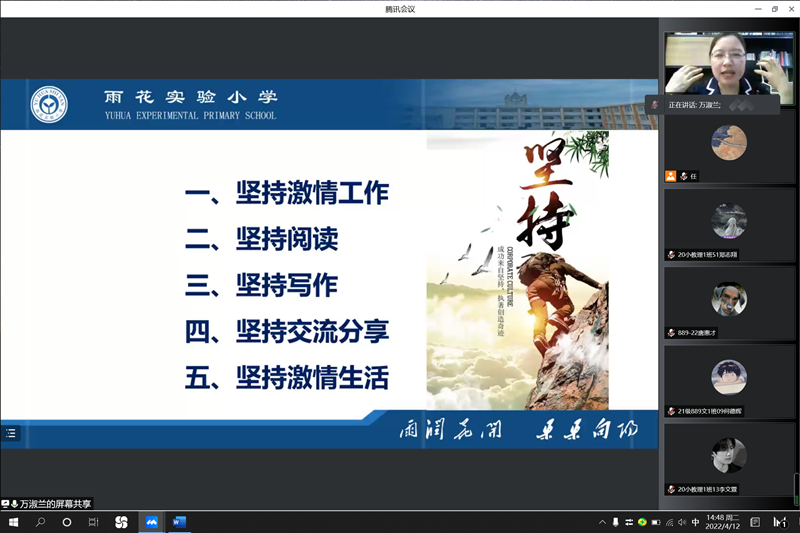 4月12日,长沙市雨花区雨花实验小学集团总董事长、湖南省特级教师、湖南省正高级教师万淑兰董事长以“名师的成长之路——坚持,终将美好”为题,利用腾讯会议,为公司参加教育见习的师范生进行了一场精彩的讲座。小学教育专业专业共计三百余名员工共同参加了此次讲座,讲座由小学教育系主任李金国老师主持。