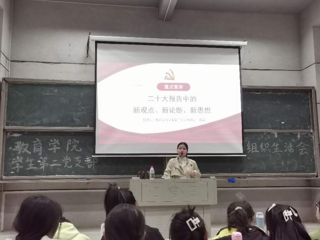 再次,支部书记杨菲老师进行了党课的宣讲。会上,杨菲老师对二十大的重要内容进行了阐述,希望每位党员同志都能够认真学习钻研党的二十大精神,履行好自己的责任与义务,增强自身的创新意识,充分贯彻好二十大精神赋予我们新时代青年的含义,谱写新时代的绚丽华章。