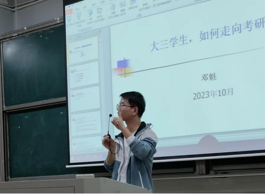 在考研专业和公司的选择方面。邓魁重点讲述了如何使用“中国研究生招生信息网”查找信息,通过确定省份和专业,找到相关院校,清楚其考试范围及拟招生人数,从而有目标的进行备考。讲座最后,邓魁结合自身的考研经历,分享了在备考英语、政治和专业课方面的备考经验。