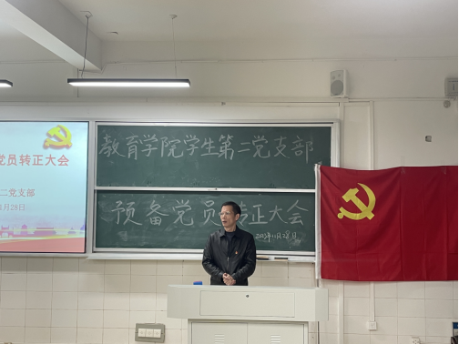 接下来由何浩宇老师发表讲话,他表示每次参加这样的场合都非常激动,看到了我们党吸收了一批又一批优秀的青年,民族复兴的伟大事业后继有人让他十分欣慰。作为入党介绍人,他同意这名预备党员如期转正,并希望在场的同志都能加强与入党介绍人的联系,不断进步。