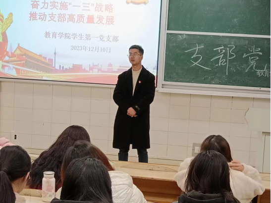 邓魁老师紧紧围绕支部应树立什么样的目标,怎样实现目标上了一堂高质量的党课。他详细分析了支部为了快速推动高质量发展而制定的“一三战略”。“一三战略”中的“一”是指用五到十年的时间,把支部建设成为全国普通高校的样板员工党支部。“三”是指“三特”“三型”“三高”。“三特”是指红色基因传承特色鲜明,师范教育专业特色鲜明,永久奋斗品质特色鲜明。“三型”是指把党支部建设成学习型、服务型、研究型党支部。“三高”是指政治理论素养高,教育和服务本领高,创新思维和研究能力高。