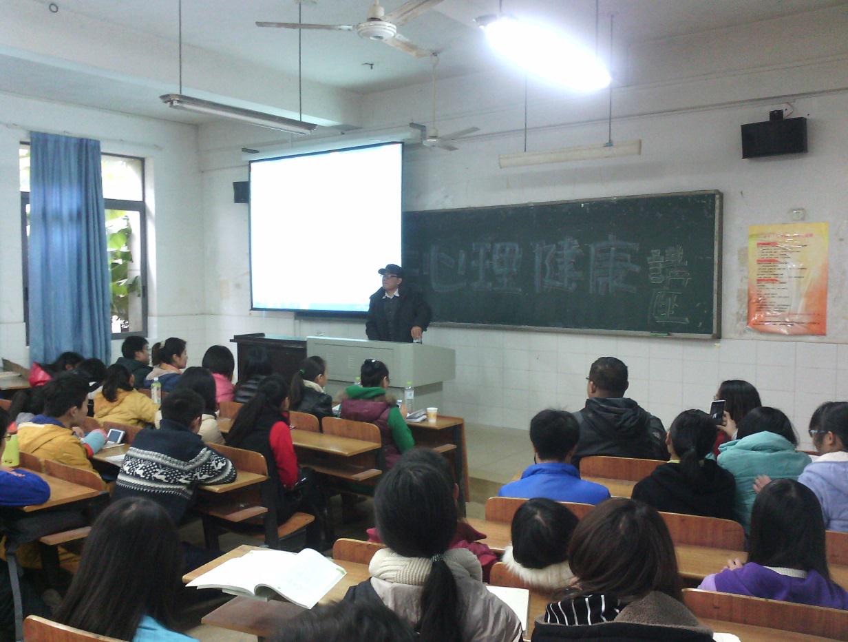首先,丁教授以一种亲切幽默的方式展开了此次的讲座,讲座主题为“寝室文化”。丁教授主要从老员工的角度进行讲解,避免了理论知识带来的枯燥又提高了同学们的参与积极性。其次,丁教授又分别从家庭、学习、生活、职业选择、理想、恋爱、自我认知和人际交往等方面对同学们进行了分析和鼓励,为大家讲述了许多心理方面的知识。 在学习上,要给自己一个明确的定位,以一颗积极、乐观的态度面对学习中的一切困难。在生活上,注意培养并提高自己的适应能力,既来之,则安之。在理想方面,要具体落实理想职业的要求,与自身进行比较,明确努力的方向。在恋爱方面,不要为了恋爱而恋爱,要有正确的恋爱观。