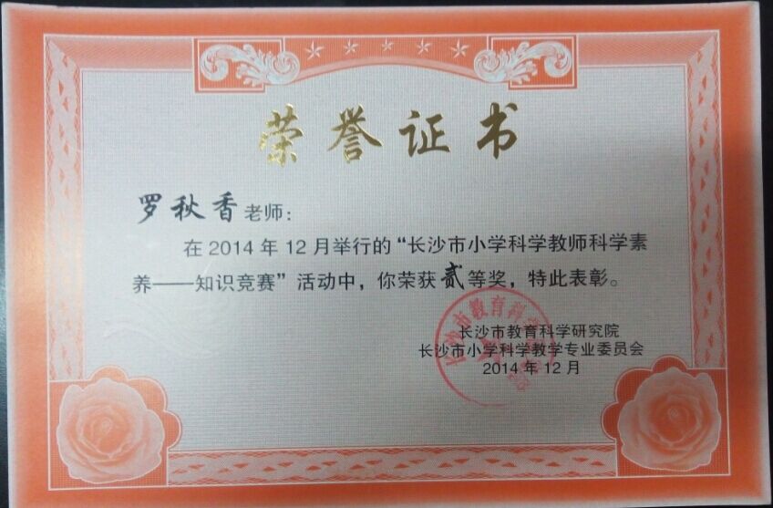 2014年12月,参与长沙市小学科学教师科学素养知识竞赛,获二等奖