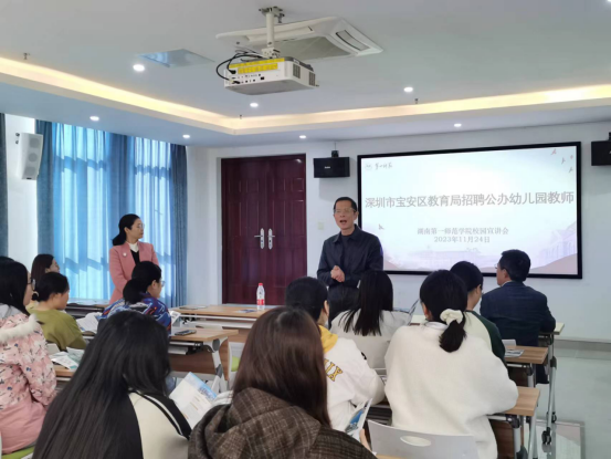 宣讲会上,张志新代表公司对深圳市宝安区教育局一行表示热烈欢迎,同时就同学们如何看待深圳就业做了简要情况介绍,万湘桂做了细致的动员宣讲,温福华对公司的热情接待表示感谢,温福华及其团队成员详细介绍了深圳宝安区以及宝安幼教发展情况。