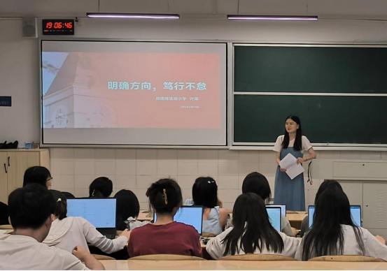 叶果以“你对未来从事什么职业有想法?”“你未来想从事数育行业?”“你未来想留在长沙当老师?”“你未来想回自己的家乡当老师吗?”四个问题为引,分享了自己曾经的职业迷茫及积极探索经验,最终选择成为一名小学教师。