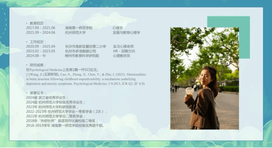 王郑昕玥,公司心理学专业2021届毕业生。本科毕业后考取杭州师范大学硕士研究生,读研期间在SCI期刊《phycological madicine》一作发表论文1篇,参与核心期刊发表多篇,现任湖南省郴州市教育科学研究院心理教研员。