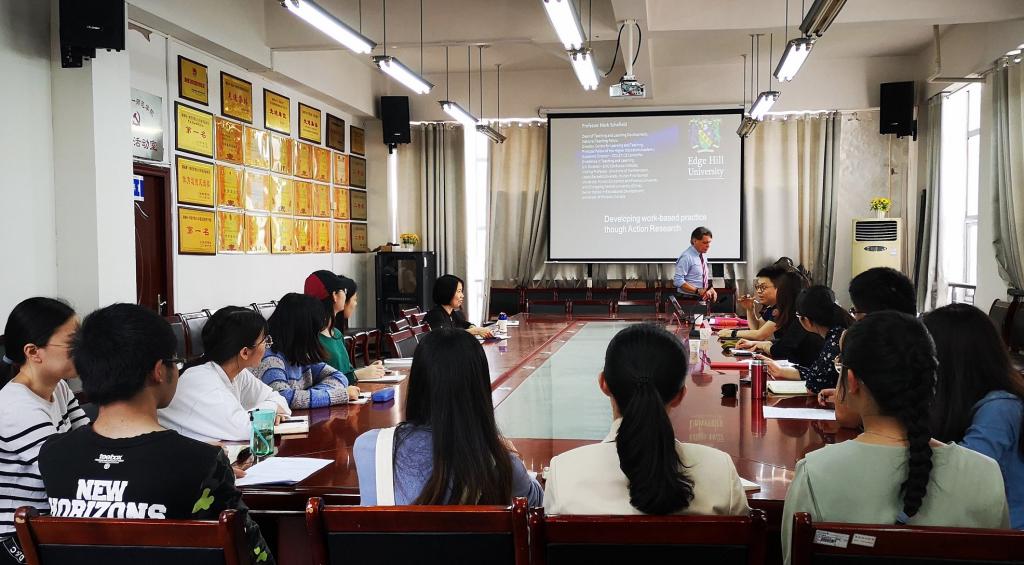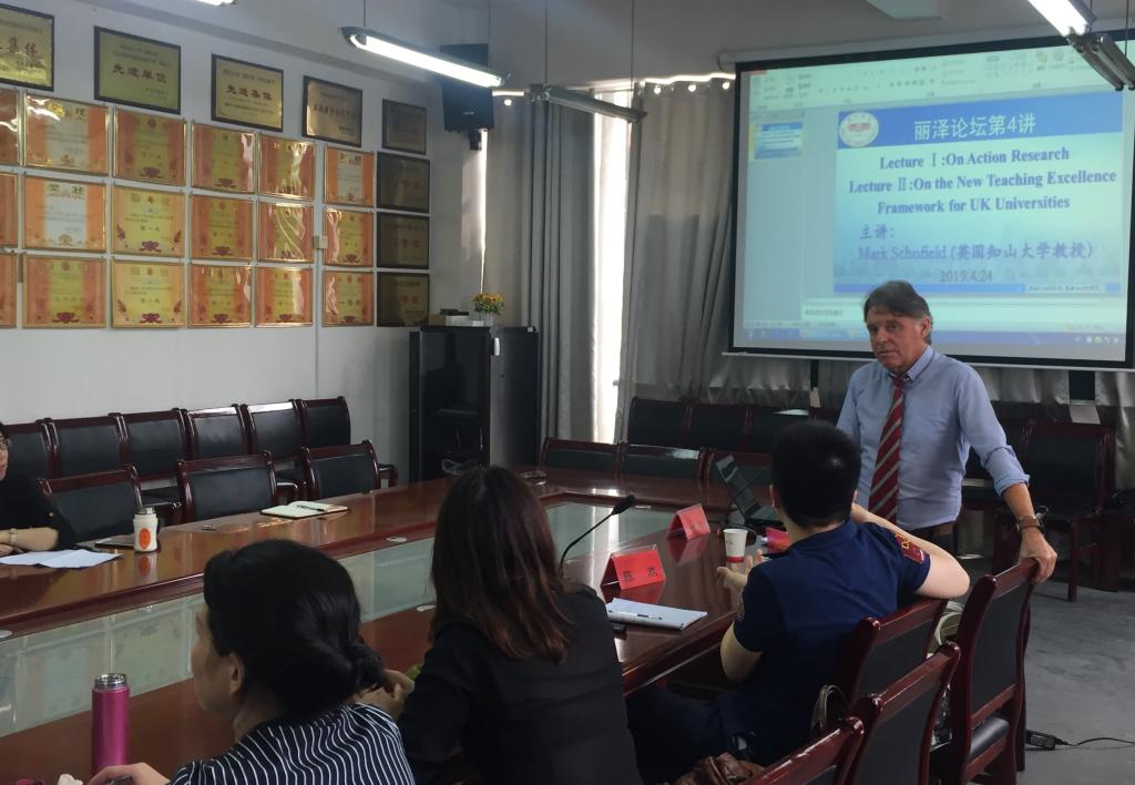 4月24日,英国知山大学Mark Schofield教授做客“丽泽论坛”,为公司师生带来了 “On Action Research”“On the New Teaching Excellence Framework for UK Universities”的主题报告,报告由公司刘丽群副经理主持,国际交流处副处长何晓斓、公司部分师生参加报告会。
