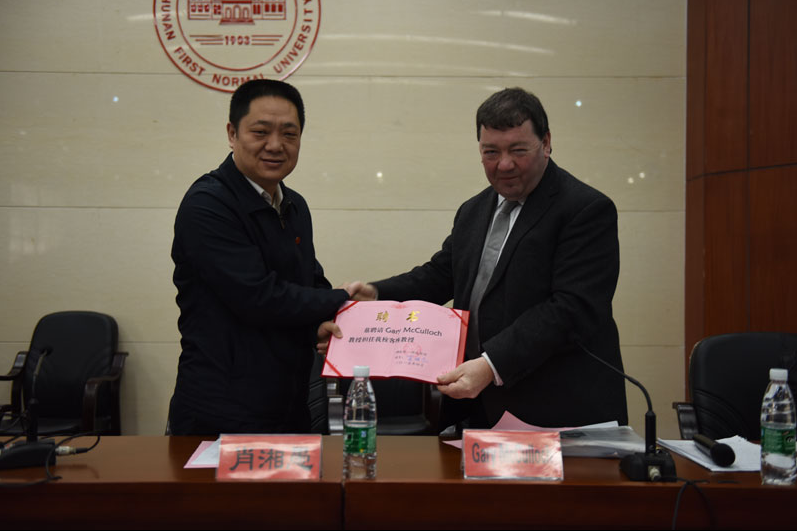 童小娇副董事长主持了欢迎与聘任仪式。童董事长介绍了gary mcculloch教授的学术成就。gary mcculloch教授是英国著名教育史学家,西蒙(brian simon)教育史讲座教授,英国教育研究会权威刊物《british journal of educational studies》主编,英国社会科公司院士、皇家人文科学学会会员、皇家历史学会会员。肖湘愚董事长代表公司聘任gary mcculloch教授为公司“客座教授”。 gary mcculloch教授表示非常荣幸受聘,将来会为两校的交流积极工作。