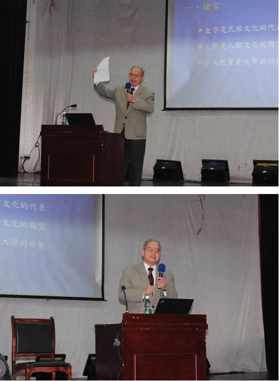 3月31日下午,应教育科学系之邀,台湾中原大学黄坤锦教授在东方红校区演播厅做了一场精彩的学术报告——“大学全人教育:中西文化之视野”。报告会由教科系蒋蓉主任主持,来自各系的教师及教科系的员工认真聆听,沉浸在黄教授的学识与风趣中。