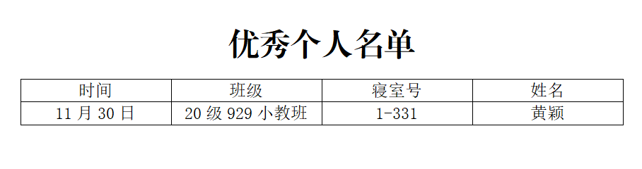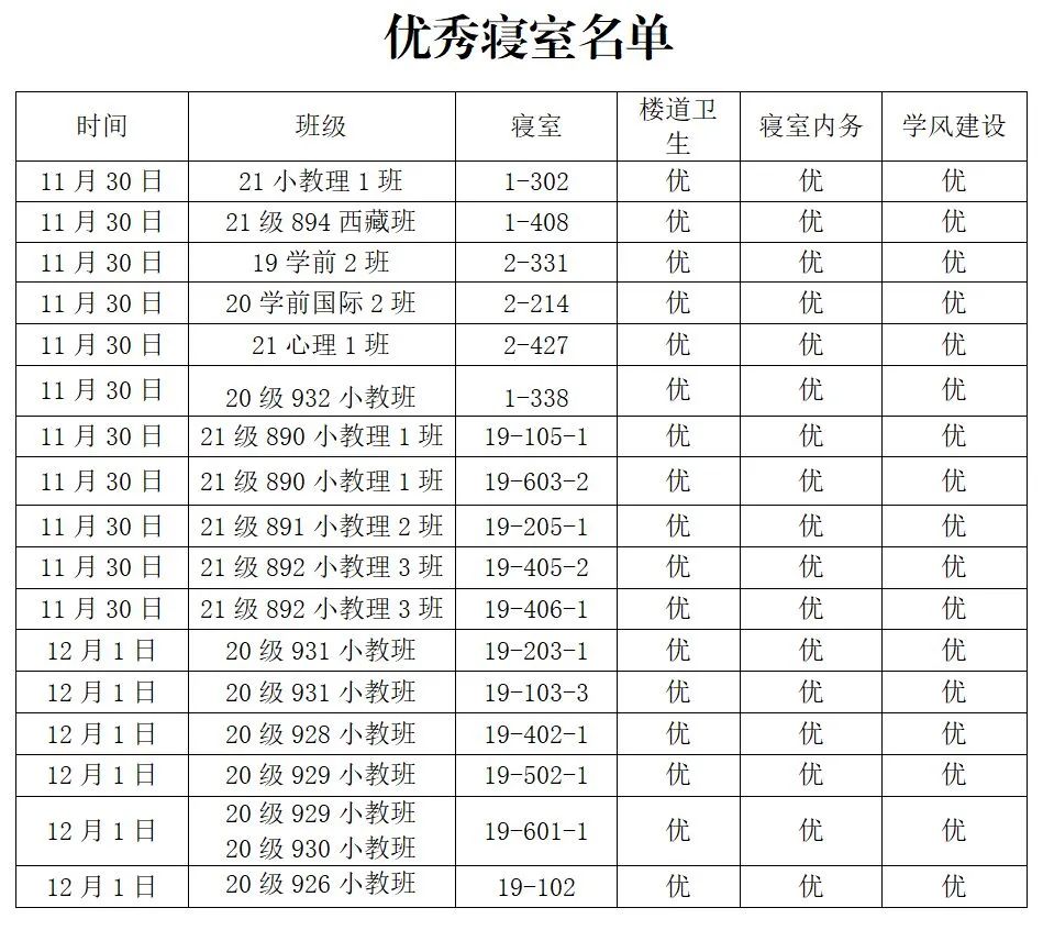 查寝过程中,员工检查人员根据实际情况,严格按照统一的评分标准对各寝室进行评选。现将“优秀寝室名单”“优秀个人名单”“不合格寝室名单”“需整改寝室名单”公示如下: