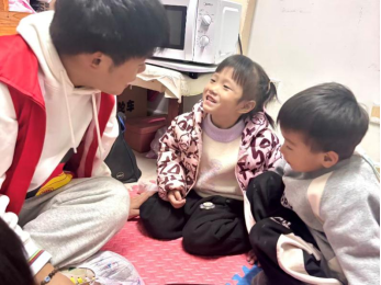 图为志愿者与小朋友们互动