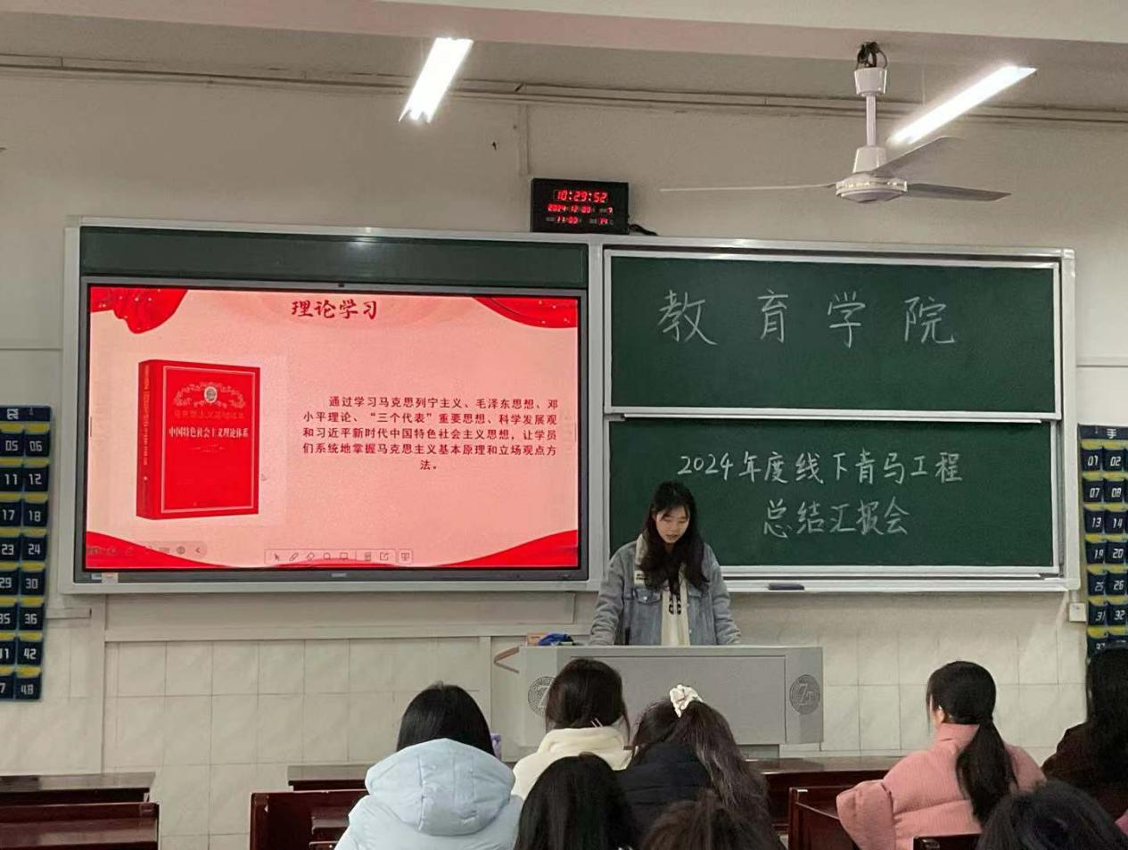 在汇报过程中,“青马工程”各小组代表依次上台,以PPT汇报、视频录制、情景演绎、演讲及小组朗诵等形式,从寓教于乐、激发团队协作与合作精神的团辅课程,到深化理论认知、提升个人思想政治素养的理论课程;从以朋辈之心分享成长历程、树立榜样力量,激励学员们上进之心的经验分享会,到以好学之心分享读书心得、传递智慧,激发学员们乐学之心的读书分享会;从学员们在集体智慧的碰撞中深刻感受阅读的魅力与思想道德教育的深远影响的“共读一本书”实践活动到学员们在轻松愉快的氛围中接受红色思想洗礼与用红色文化培根铸魂深远意义的“红色故事宣讲下寝”实践活动。多维度、全方位地展现了各小组成员在“青马工程”培训期间的学习征途与实践硕果,共同编织了“青马”学员们成长成才的壮丽篇章。